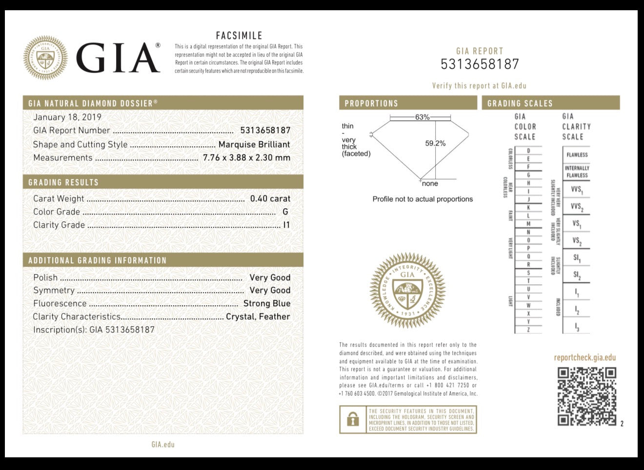Comes with one GIA certified 0.40 carat G- I1 marquise diamond center in 14k white soldered to 14k yellow solid gold bead chain. Adjustable from 16 to 18 inches with lobster clasp. Diamond is engraved with serial number on the girdle.